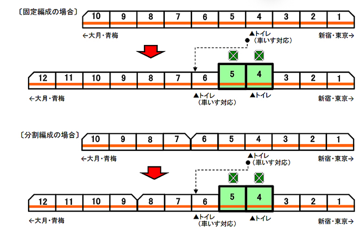 あと中央線グリーン車って貫通路は使うなって表示あるから1号車から3号車と分割編成の9号車から12号車だとそのまま走行中にはトイレに行けない事になるのもあるよ物理的に
