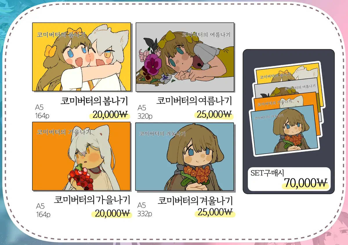 | … | 7225/08/16(土)00:22:19No.1343609598+コミバタイラスト集…春夏秋冬合わせると8000円なので躊躇してしまいます… |
