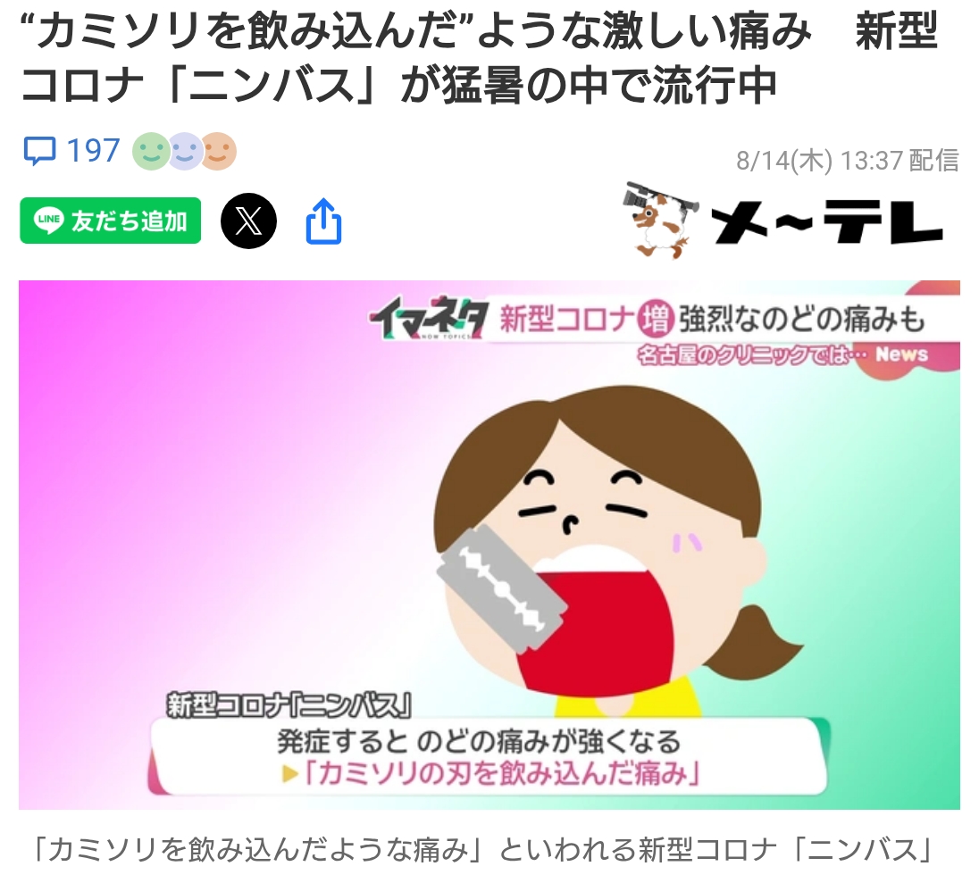 | … | 17425/08/16(土)08:00:35No.1343663165そうだねx1普通のコロナでも死ぬほど喉痛かったのにあれ超えるのか… |