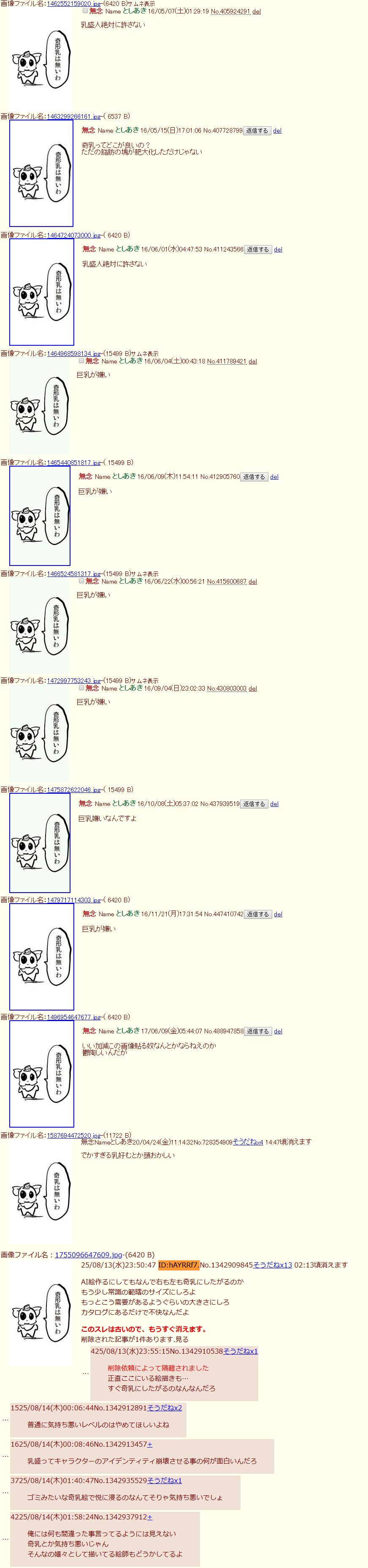 | … | 325/08/17(日)16:46:02No.1344149884そうだねx3>クソ気持ち悪い奇乳絵のAI貼る奴ってほんとなんなんだろう |