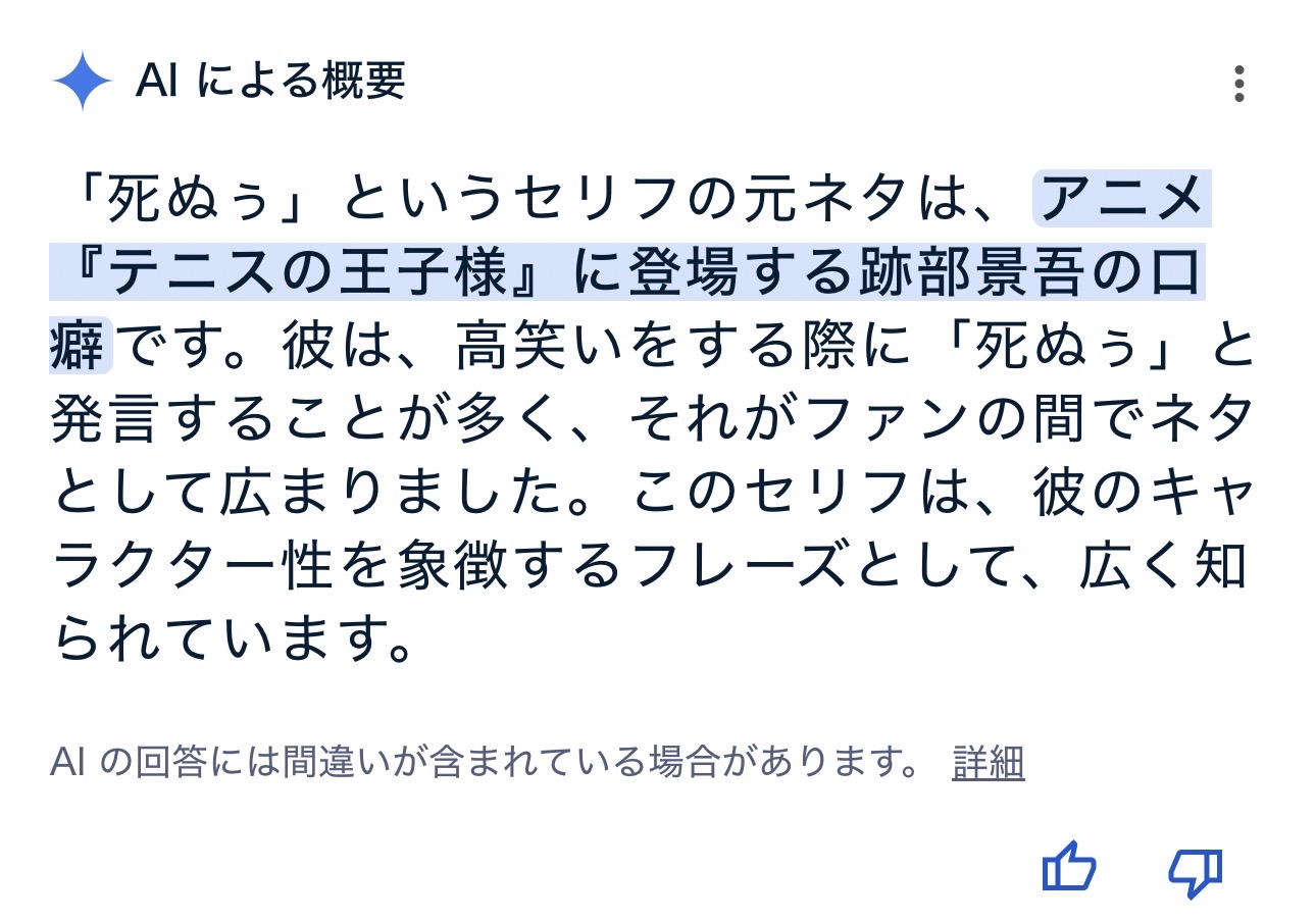 | … | 3725/08/18(月)17:07:15No.1344492117そうだねx6>ぐぐった時に出てくるAIまとめは読む価値が無いんじゃなくて読まない方が良いレベルのノイズ |