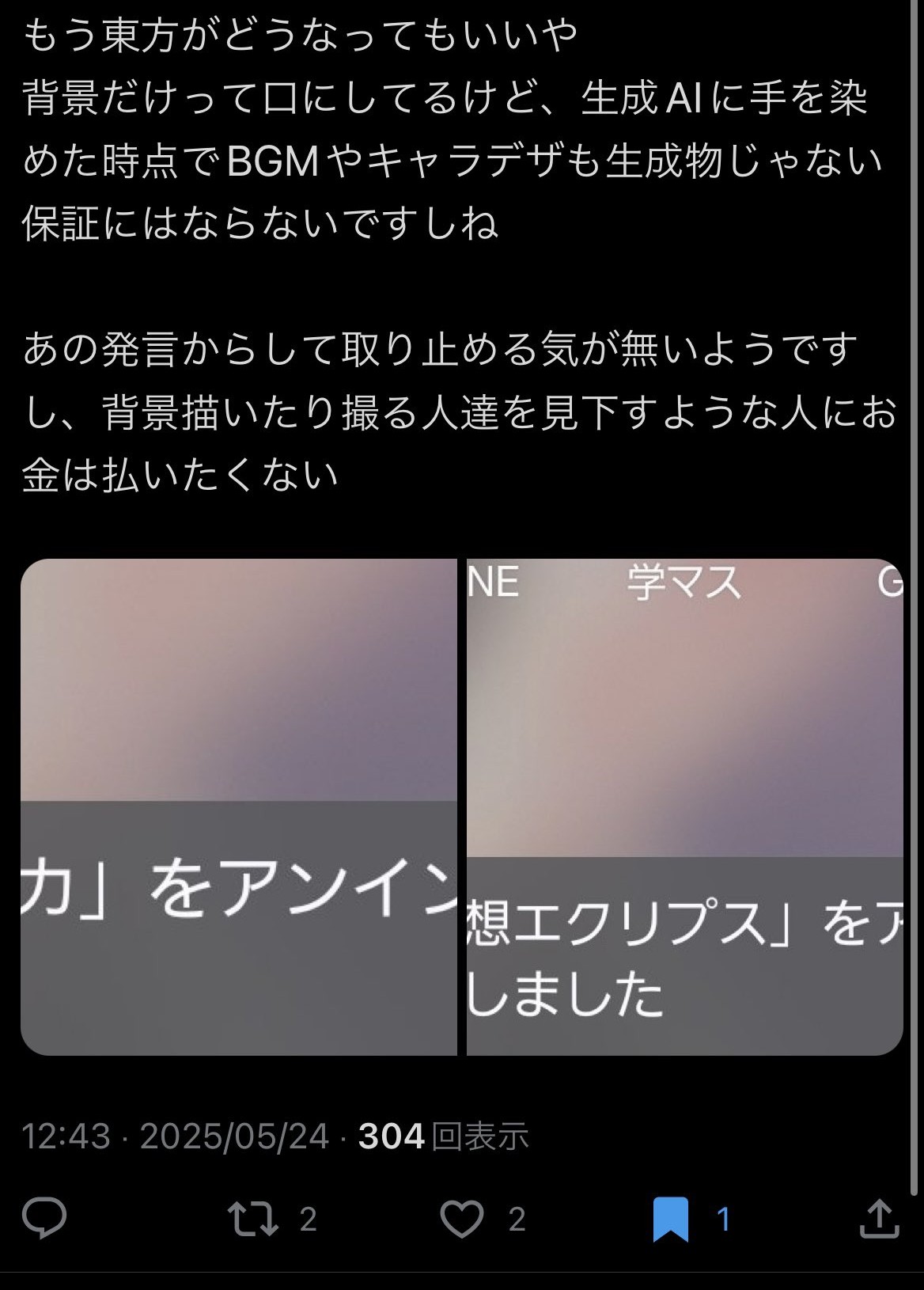 | … | 2925/08/21(木)10:40:28No.1345356806そうだねx10>>東方二次描いてる奴で反AIとかいんのかな |