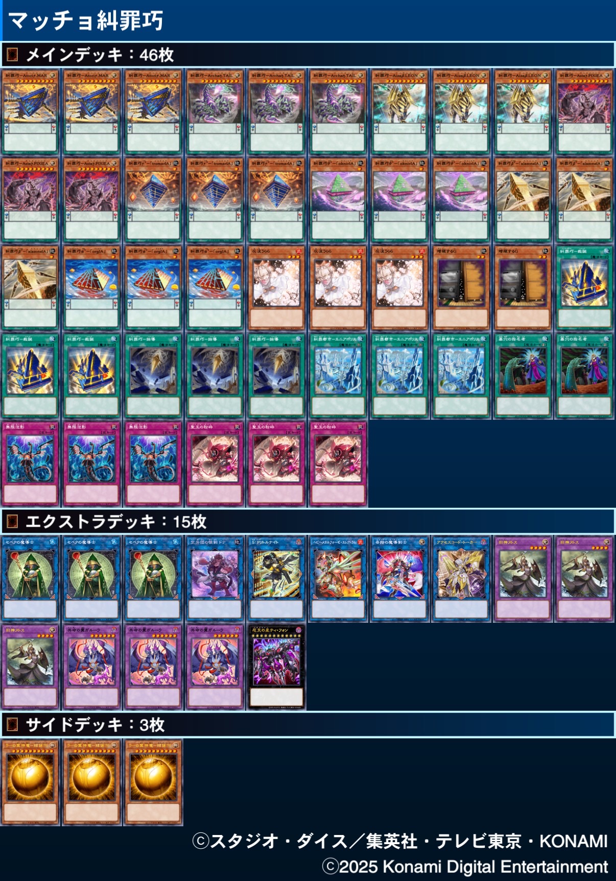 | … | 33325/08/22(金)10:27:41No.1345659598+>>>糾罪巧はサーチ効果が3枚からランダムな関係上全員3積みしたいのは山々だけどそうすると多分デッキが嘘でしょ…みたいなことになる |