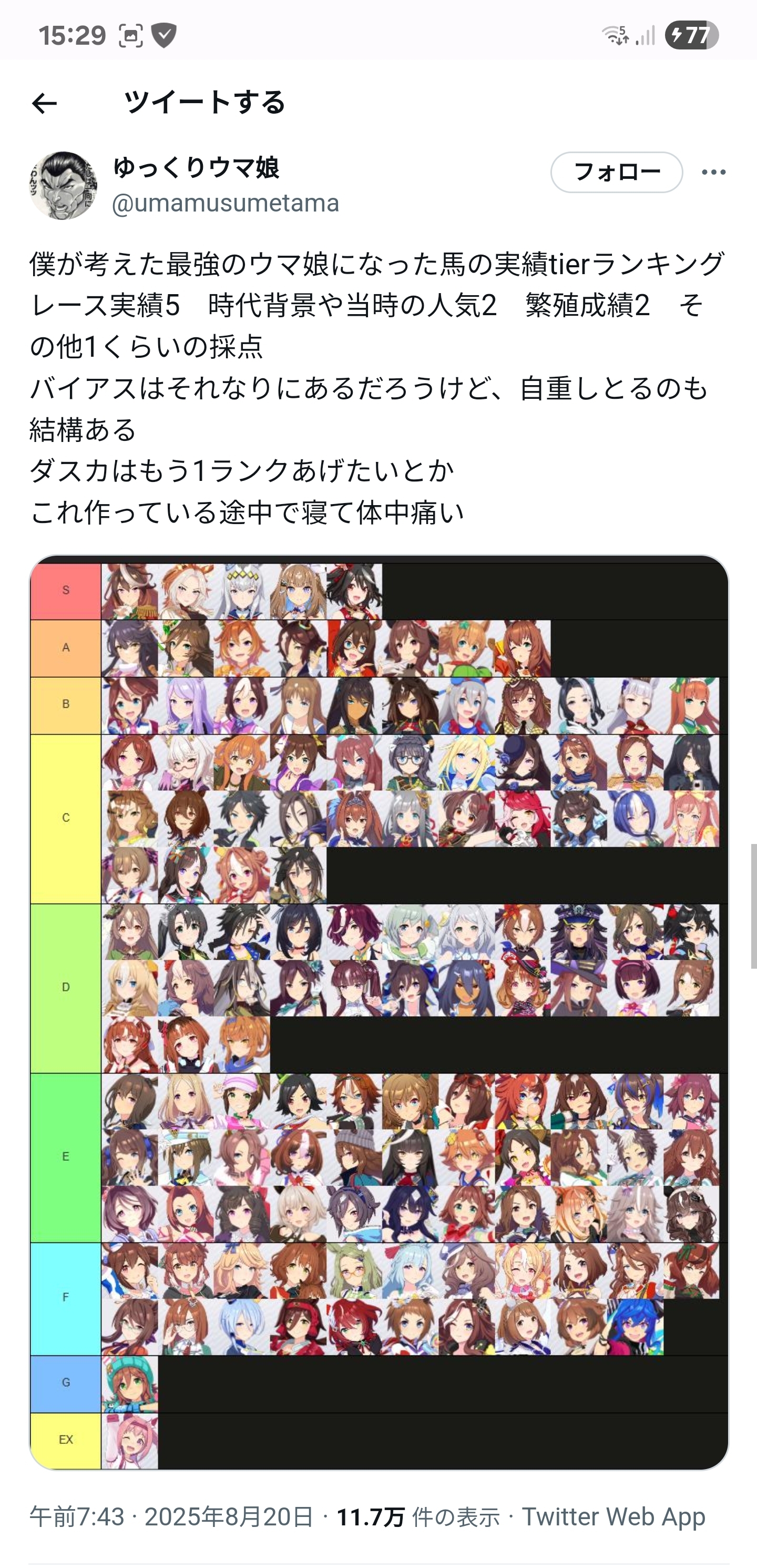 | … | 9225/08/22(金)15:51:46No.1345729749そうだねx2単純にキタちゃんSにいてオペウオドンナタイキ辺りがAなのはエアプがすぎるだろ |