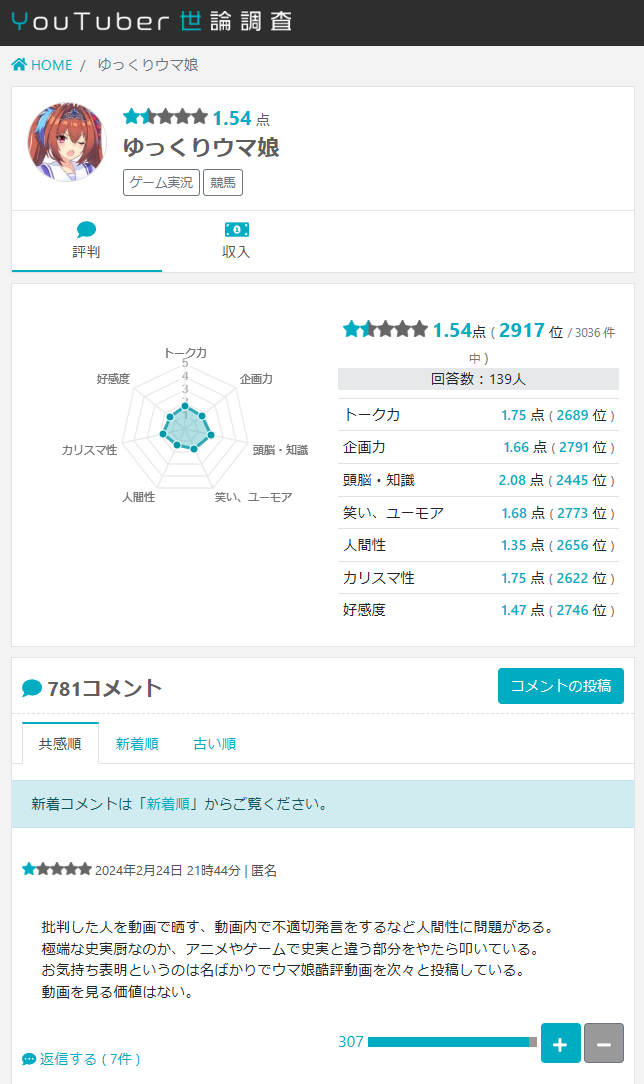 | … | 5825/08/22(金)15:45:24No.1345728595そうだねx10>ウマ娘にすり寄らないと自己顕示欲満たせないのにウマ娘をオワコンと言い続けるおじさんがアンチじゃなかったらなんなんだよ |