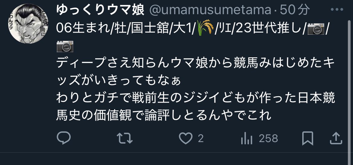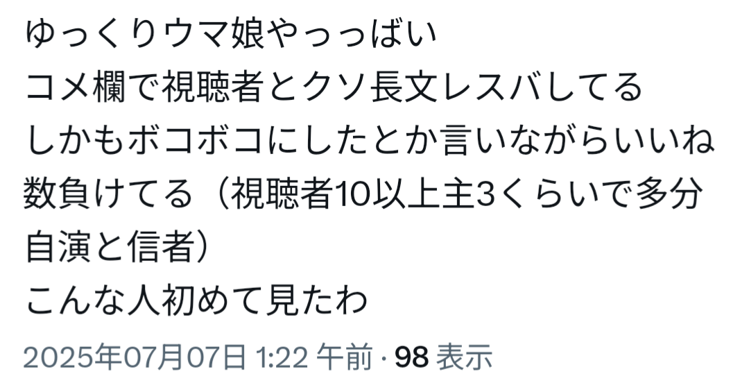 | … | 3425/08/22(金)15:40:52No.1345727787そうだねx10ウマ娘にすり寄らないと自己顕示欲満たせないのにウマ娘をオワコンと言い続けるおじさんがアンチじゃなかったらなんなんだよ |