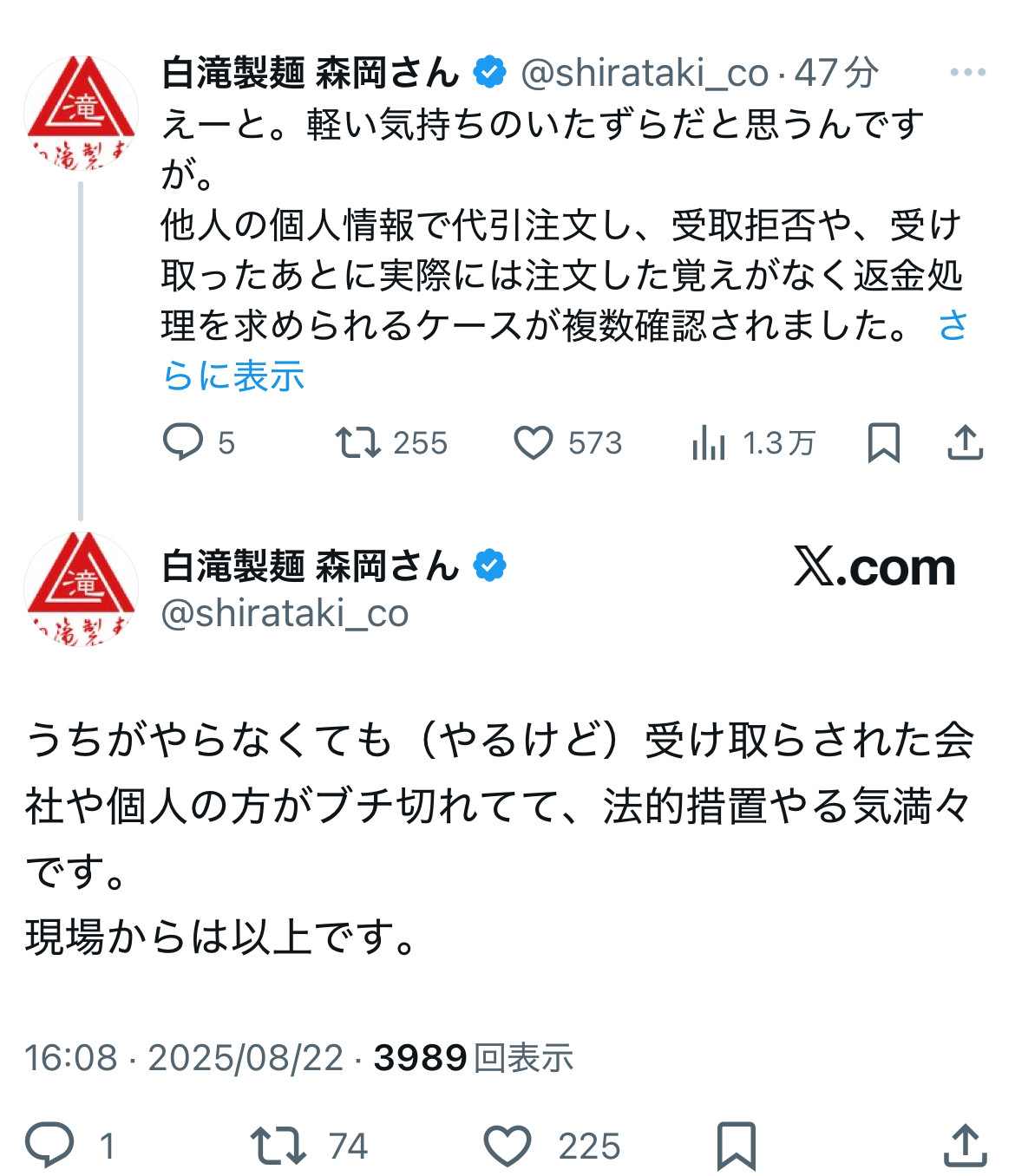 | … | 6525/08/22(金)17:39:38No.1345752366そうだねx3>ああなるほどここのそうめんを他所の会社とかの名義使って勝手に注文してる奴がいるって事か |