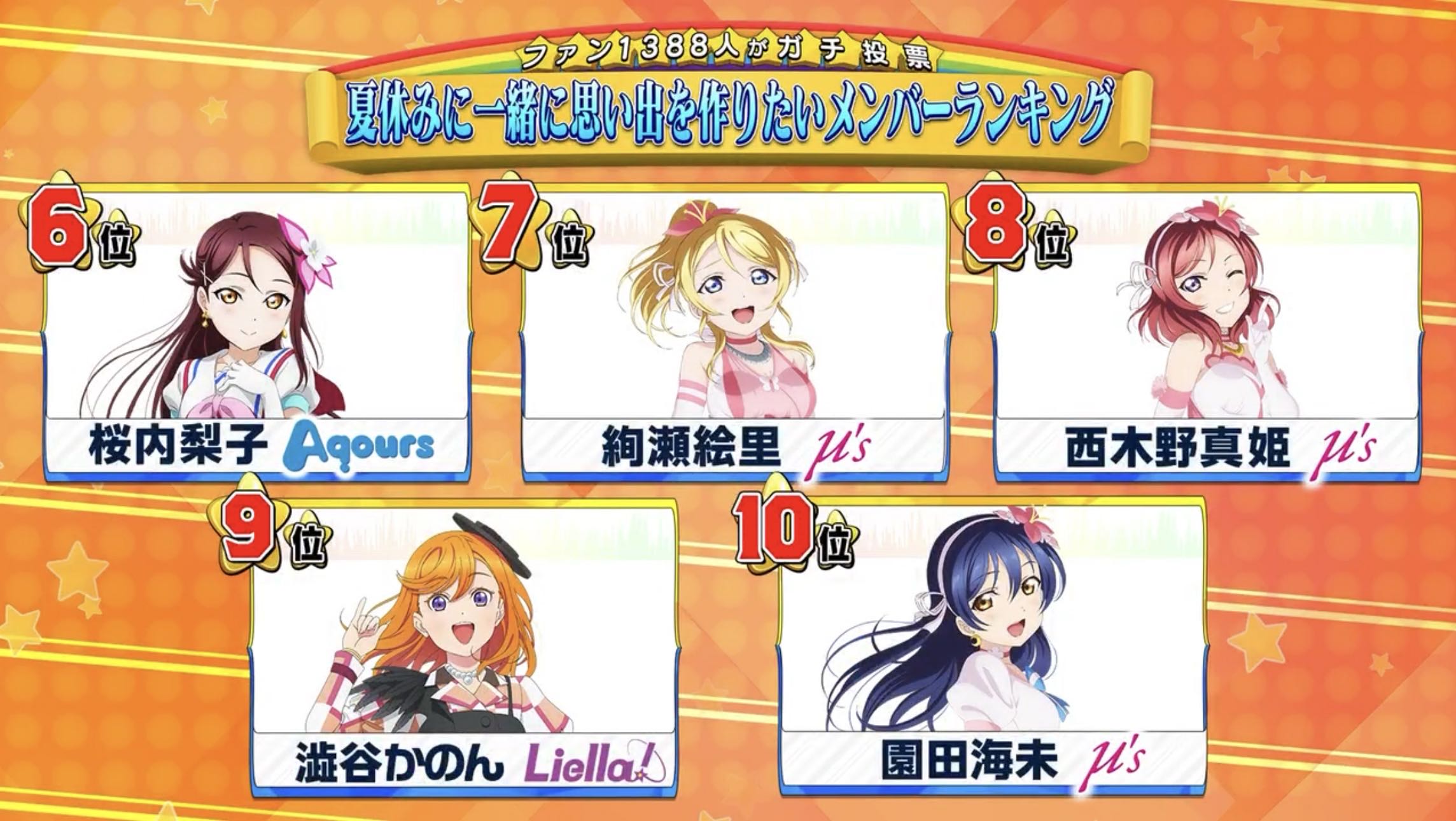 | … | 18225/08/23(土)22:49:30No.1346220665+>トップ10他のメンバーμ'sとAqoursだけだったのに一人ランクインできるかのんちゃんすごくない? |
