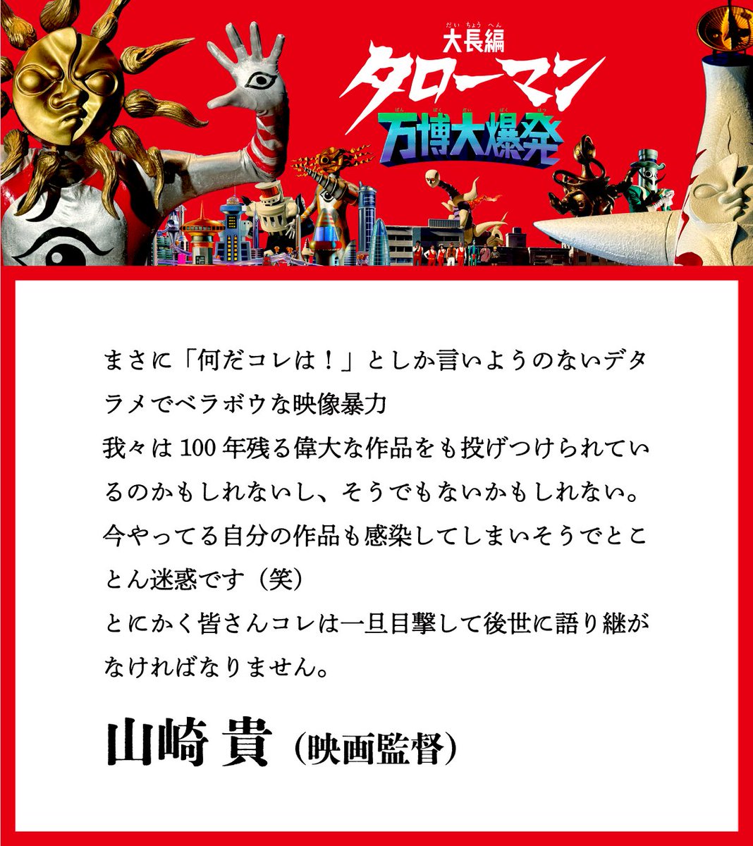 | … | 42925/08/24(日)16:53:17No.1346459907+>監督とタローマンの中の人だけでもう一本行けそうだな! |