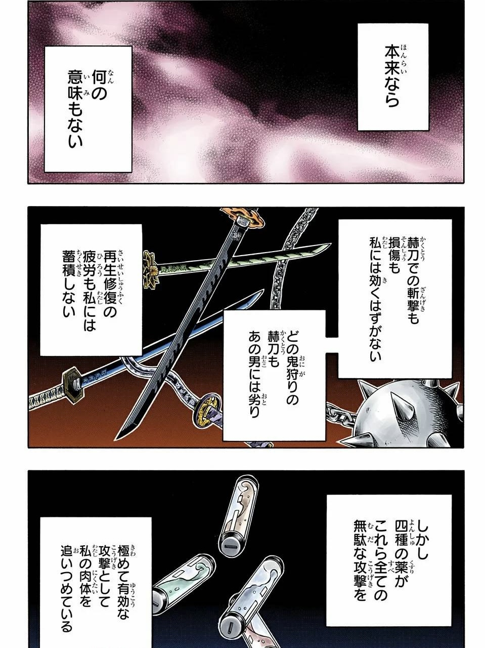 | … | 34125/08/24(日)22:22:09No.1346590472そうだねx2無惨が薬がなかったら何百回攻撃されようが即再生するし全く疲労しないから無意味だって言ってんだから |