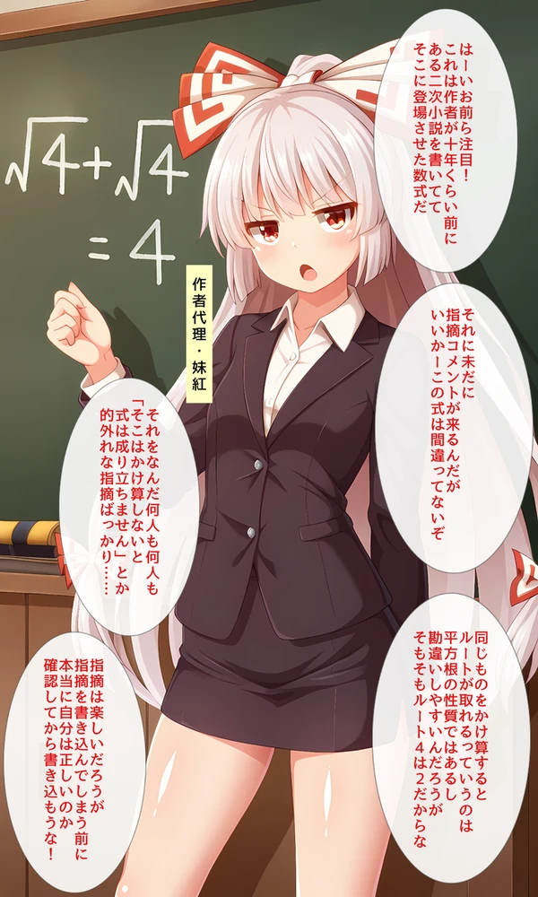 | … | 3525/08/30(土)09:32:51No.1348218265+わかるけどまず√4という表現で式を作る意味がそういう愚か者を釣るためだけですよねっていう感じがする |