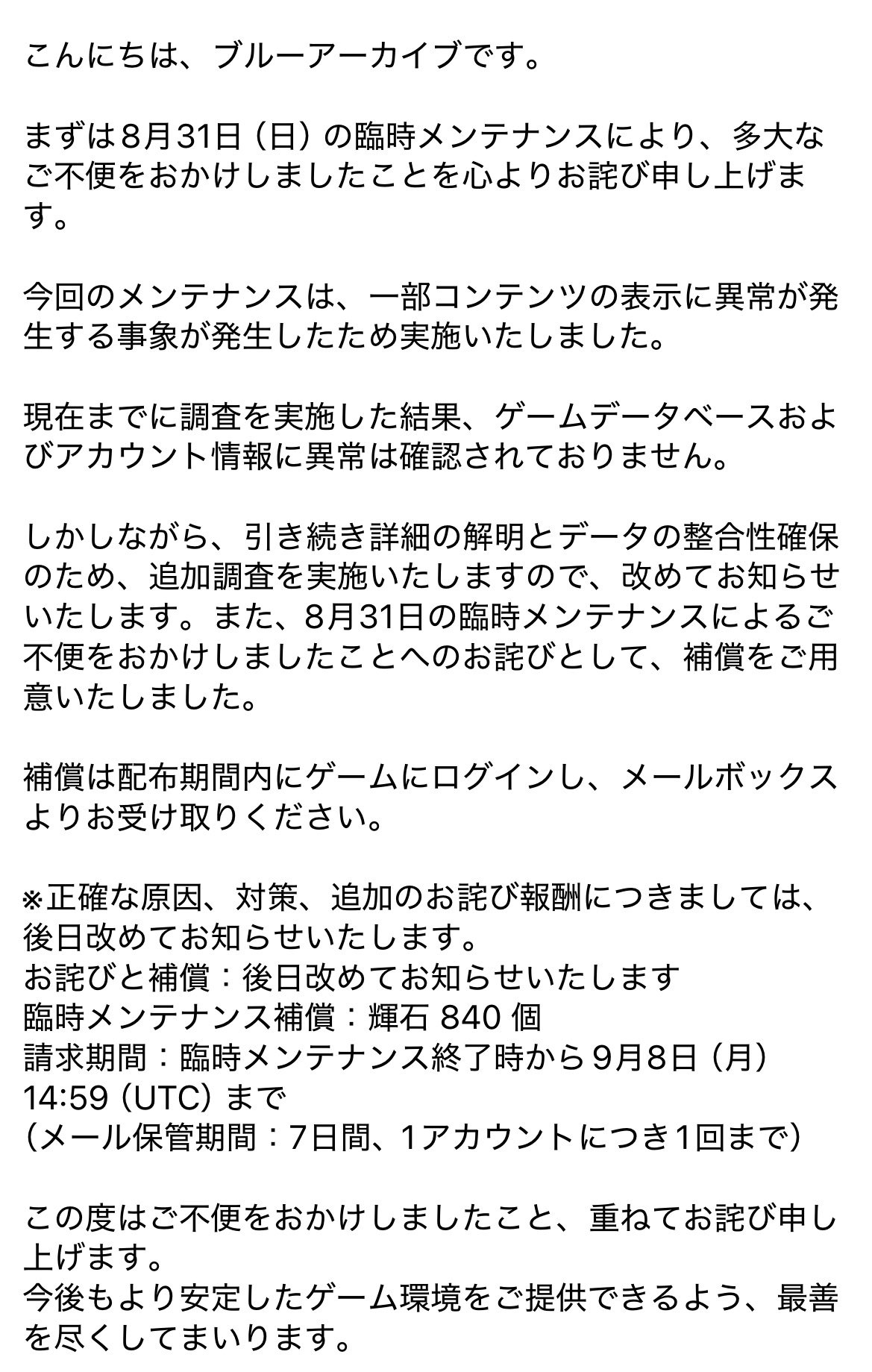 | … | 35625/09/01(月)10:05:06No.1348914340+6時間メンテ終わりって前にあった日本のロングメンテみたいに詫びで日付跨ぎたくないからさっさと開いただけじゃないの? |
