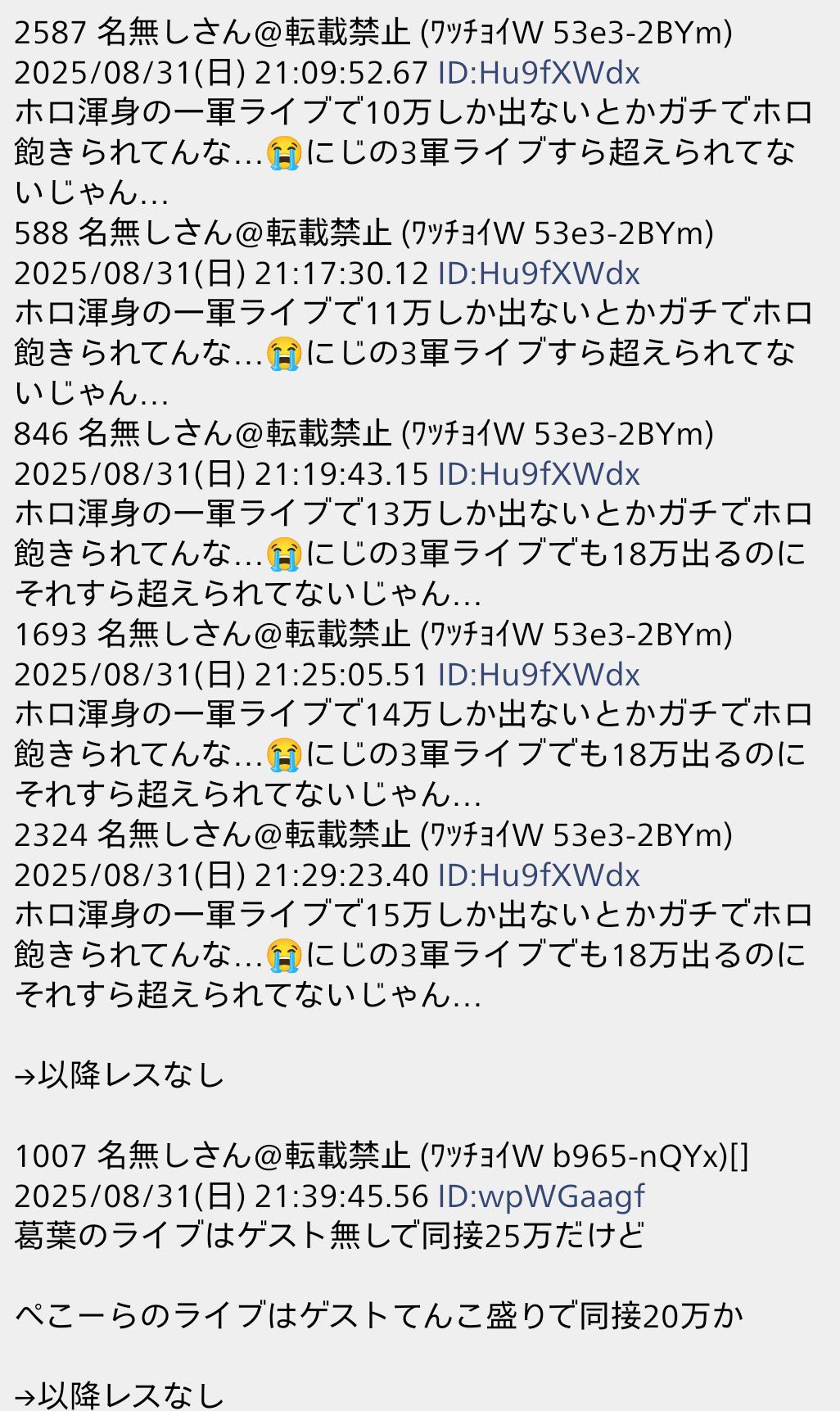 | … | 26625/09/01(月)16:40:35No.1348996342そうだねx4>ネタバラシしちゃうけどそもそも卒業卒業言ってるのはアンチ板とにじ実況板の連中だけでそいつらは今回のライブが誕生日記念を卒業の影響で前倒ししたものだからというのを根拠にしてる |
