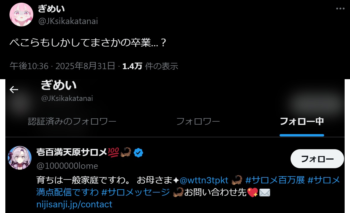 | … | 28025/09/01(月)16:51:05No.1348998422そうだねx6AZKiがゲリラメン限やったから卒業するんだ!もにじさんじが卒業前にメン限匂わせすることのミラーリングだったんだろうな |