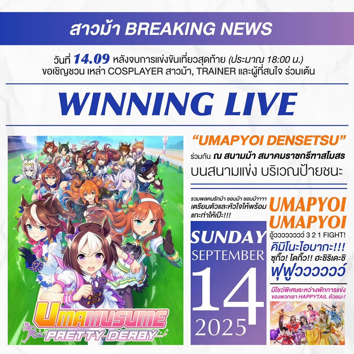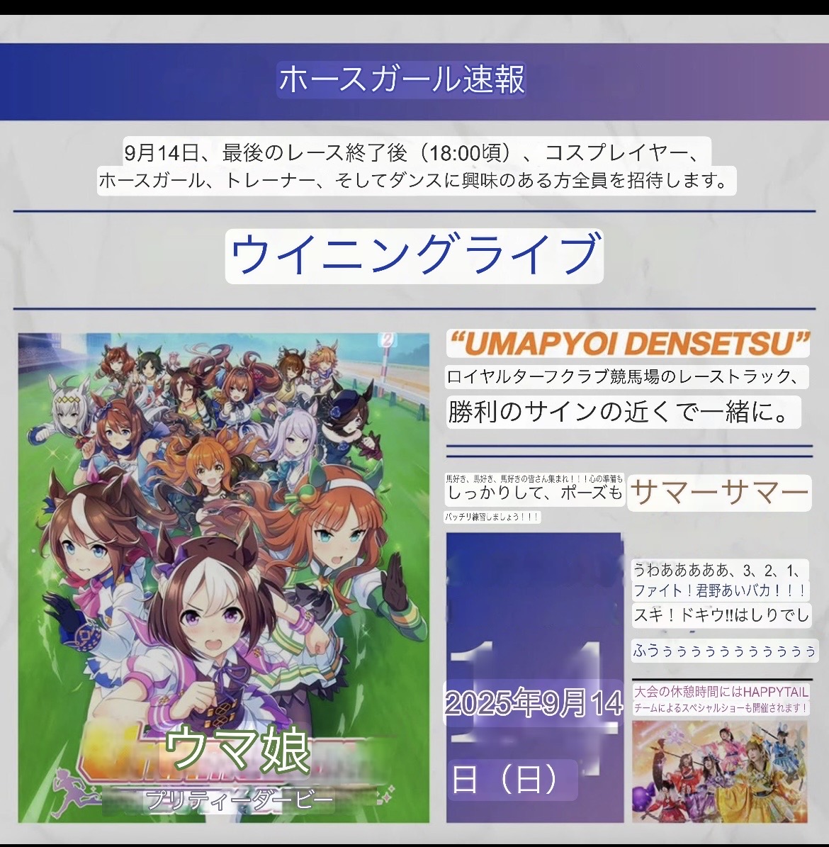 | … | 625/09/01(月)23:28:07No.1349154542+>9月14日、最後のレース終了後(18:00頃)、コスプレイヤー、ホースガール、トレーナー、そしてダンスに興味のある方全員を招待します。 |