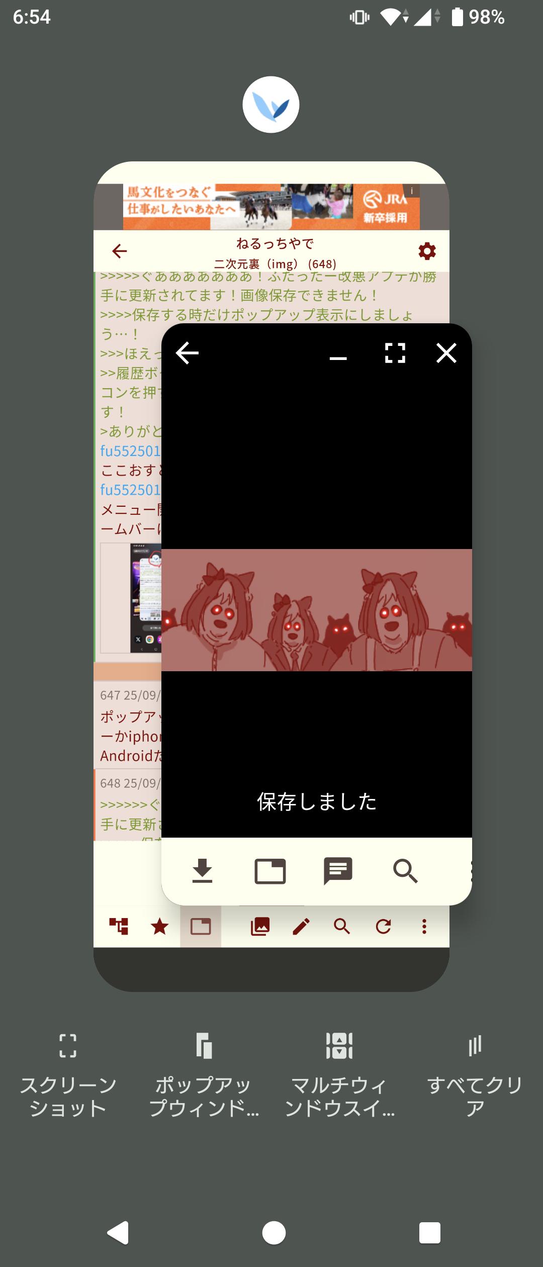 | … | 63525/09/02(火)06:48:23No.1349212824+>>>>ぐあああああああ!ふたったー改悪アプデが勝手に更新されてます!画像保存できません! >>>保存する時だけポップアップ表示にしましょう…! >>ほえっどうするんでしゅか…? >履歴ボタン押したあとアプリウィンドウの上のアイコンを押すとメニューが出てくるのでそれで選びます! ありがとうございます試しましゅ |