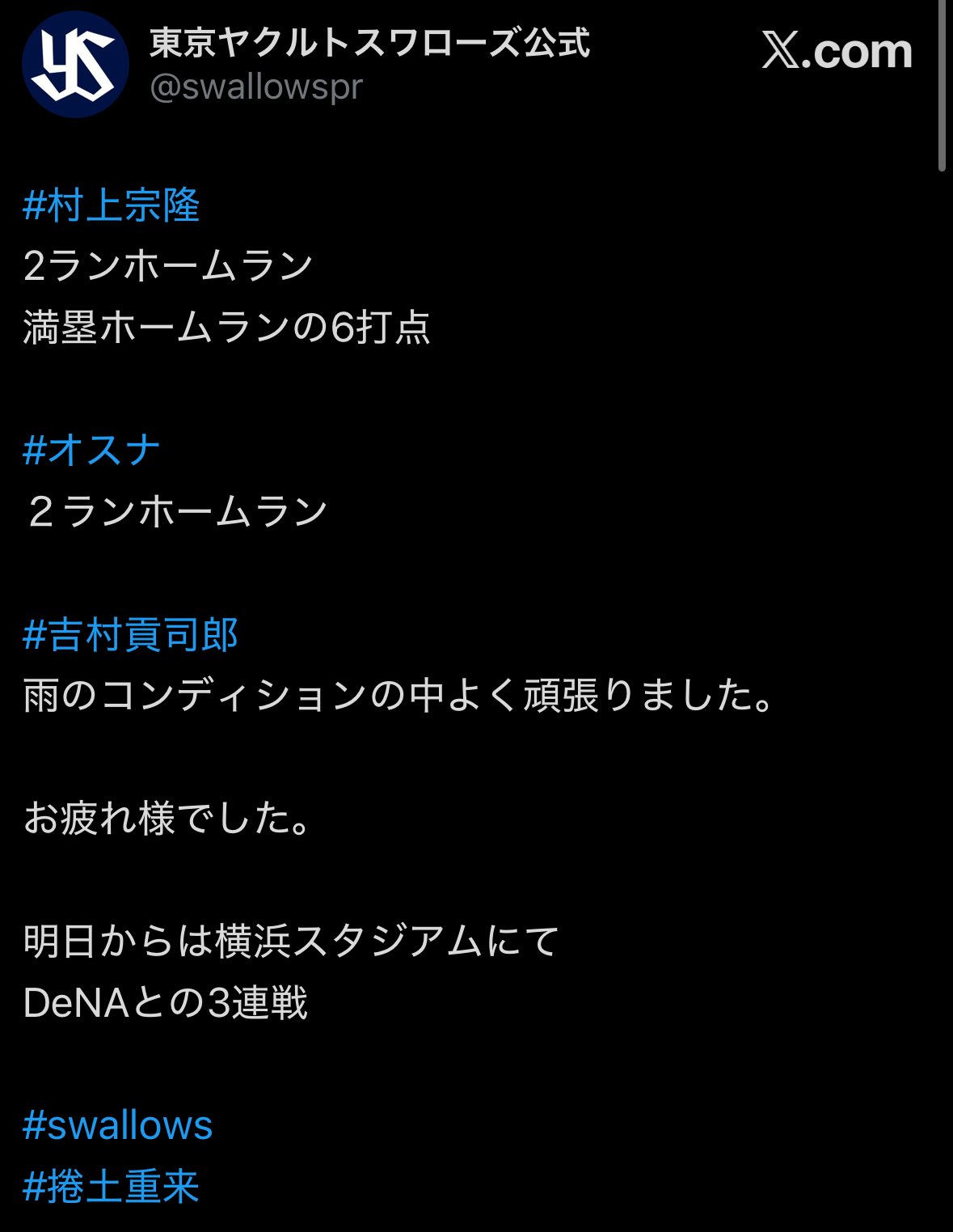 | … | 43725/09/05(金)13:01:42 ID:R4fvMAH6No.1350147778そうだねx2この度、当球団のファン(@swallowsamateur)を装った「」のレスが確認されました。 |