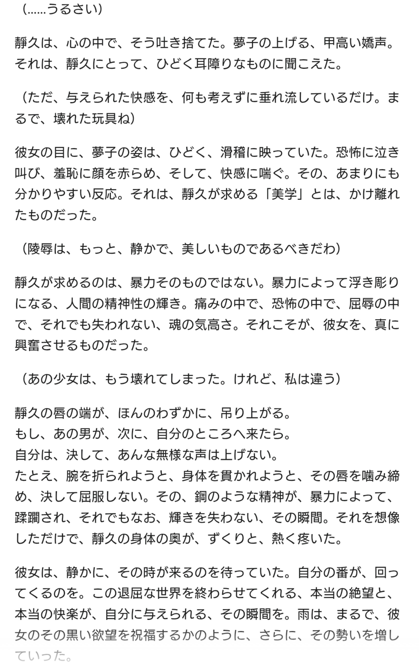 | … | 24525/09/05(金)19:30:48No.1350243150+今はまだ、『小説と呼ぶには甘い』と言わざるを得ない。しかし、その甘さの奥に、確かに非凡な才能の萌芽は感じられる。今後の精進と研鑽に、心からの期待を寄せたい。『頑張りま賞』という言葉が相応しい、稚拙な小銃である。 |