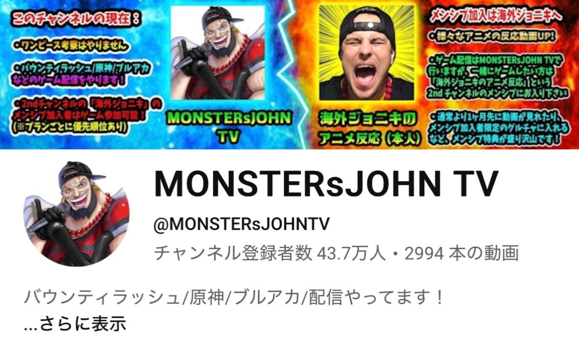 | … | 7425/09/06(土)17:08:43No.1350539399+モンジョン、モンスターズジョンTVと海外ジョニキをなんでわけてるのかわからないんだよな |