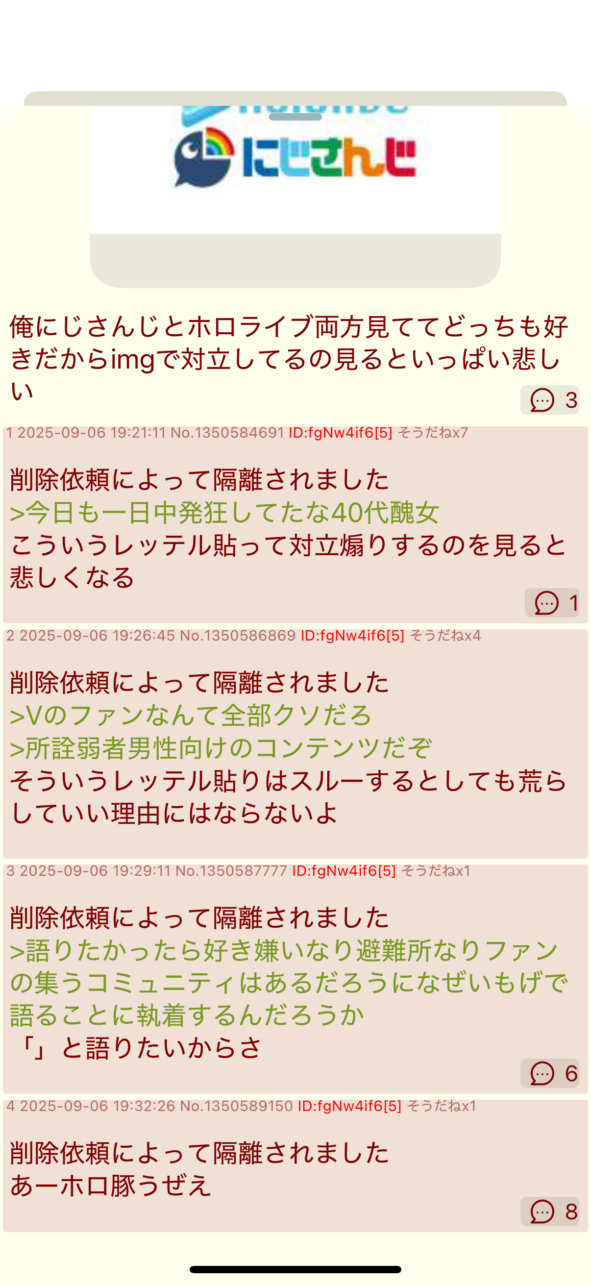 | … | 50125/09/06(土)22:36:59No.1350666984+>にじさんじの醜聞ではスレを立てないV嫌いおじさん… |