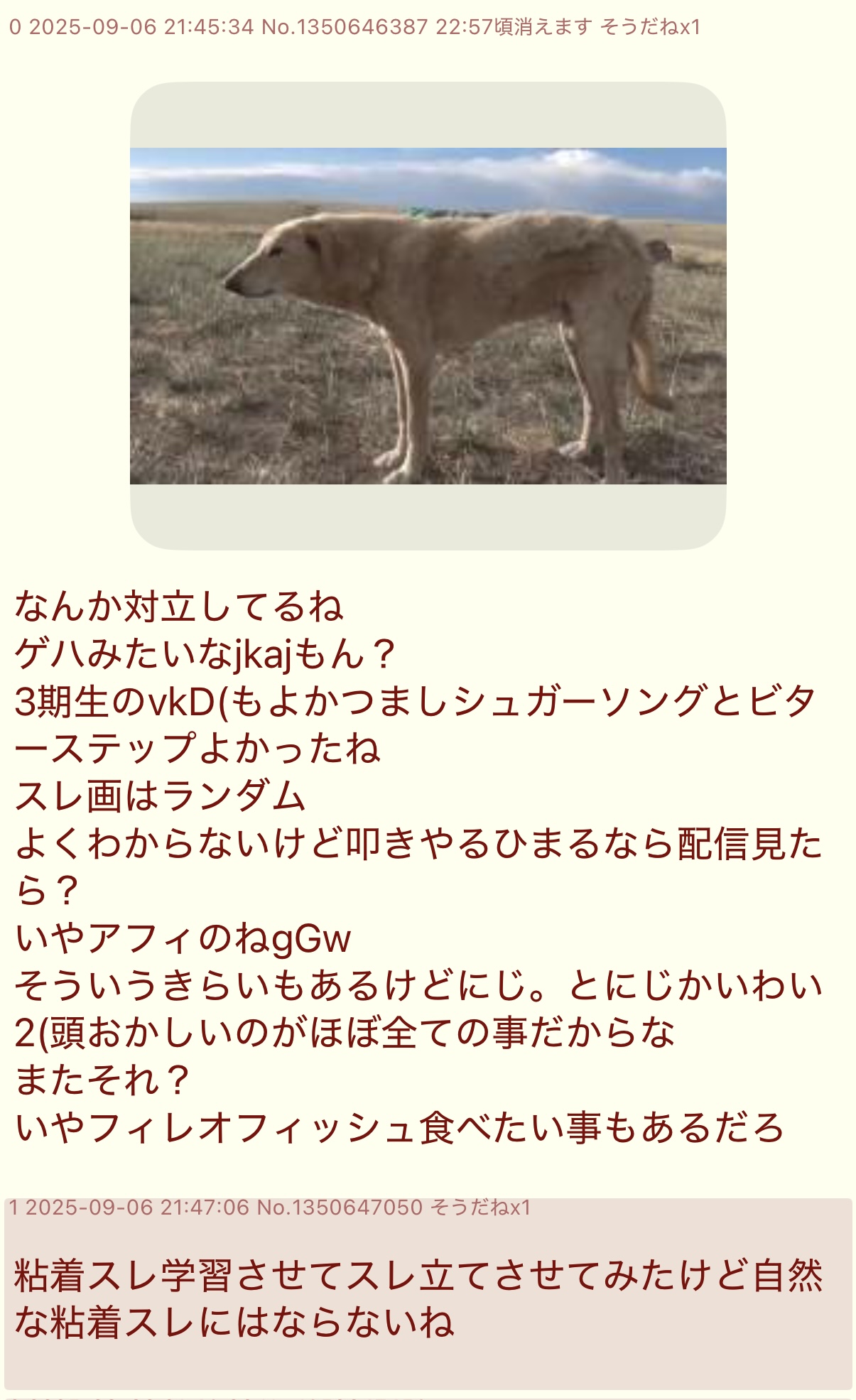 | … | 9025/09/06(土)21:48:28No.1350647676そうだねx2別に対立煽りがいるって主張してくれてもいいんだけどこうやって粘着ネタの偏りだったり名前付きで見つかってる下手人の証拠だったりについてどう説明できるのか冷静に議論しようとしても壁打ちだのなんだの言って向き合わないじゃん? |