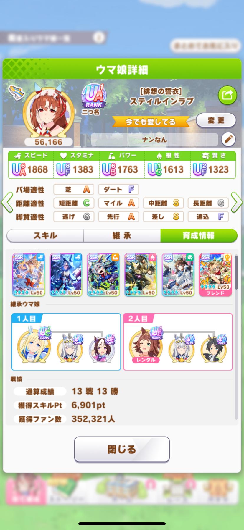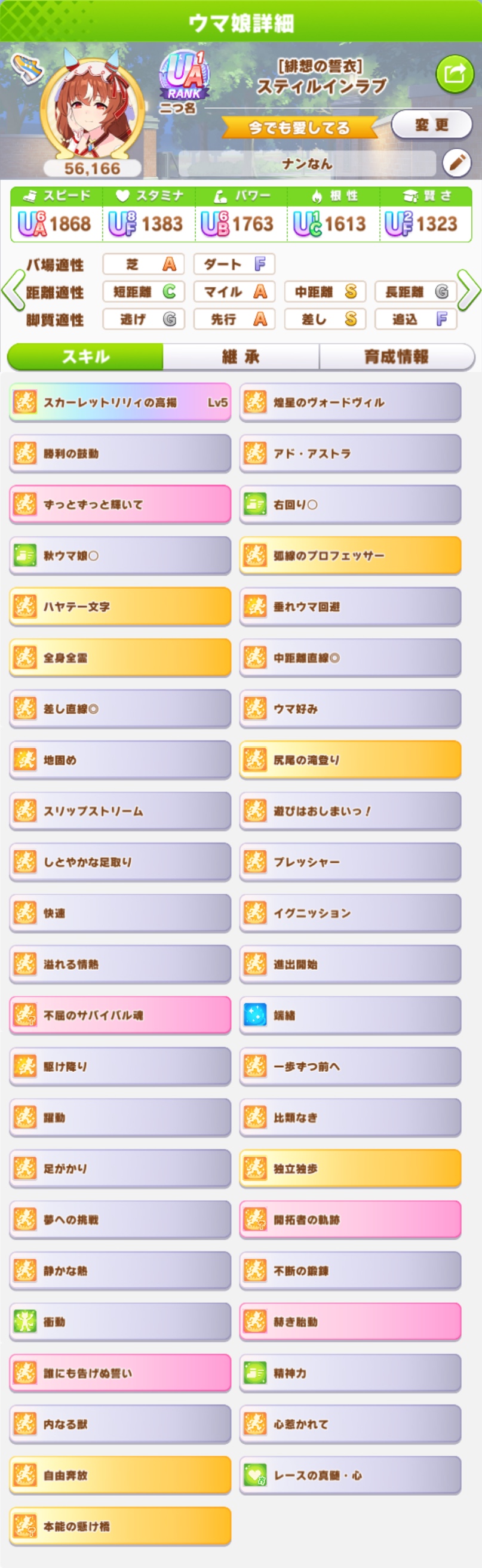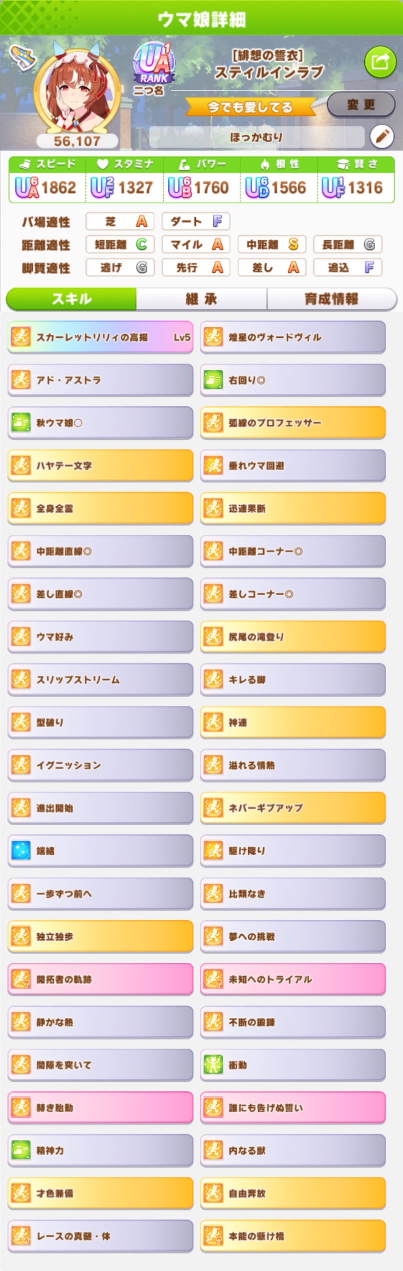 | … | 1425/09/07(日)10:24:23No.1350792527+>こっからタマとアルヴの金スキルしか完走しなかったのがうちのスティルだ |