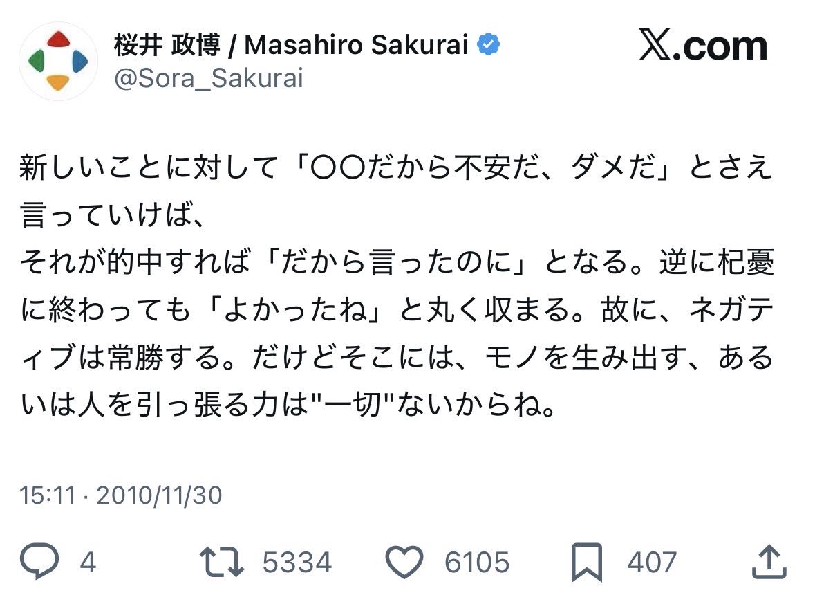 | … | 2425/09/10(水)13:06:53No.1351799190そうだねx42スレ画は冷笑を否定する投稿でスレ「」は「ネガティブは常勝しちゃうから冷笑はネットで流行ったんだな」って理解した |