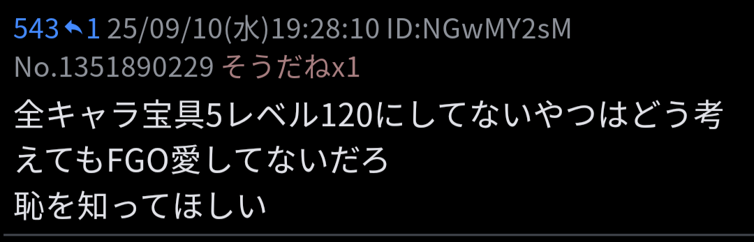 | … | 6825/09/10(水)20:51:55No.1351923126そうだねx1>だからってグランド120にしてるスクショにfgo好きじゃなさそうとか宝具5じゃないから愛が無いとか頓珍漢なレスするような奴を擁護する余地ある? |