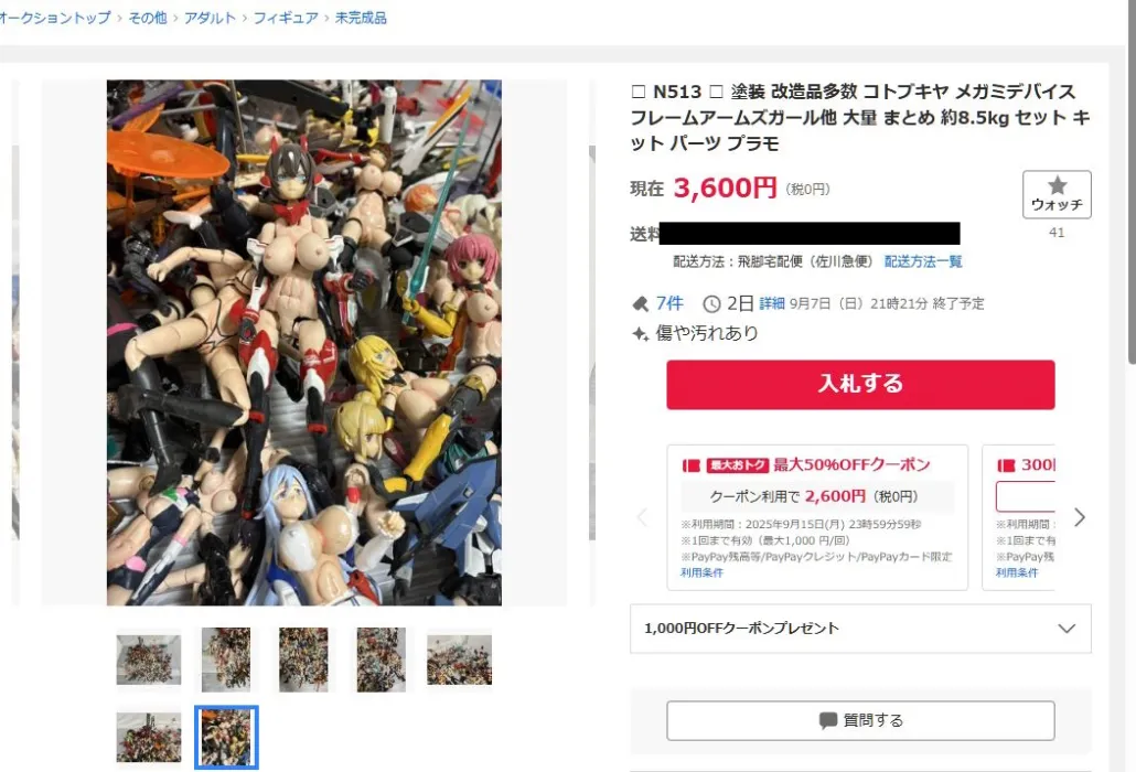 | … | 26125/09/11(木)02:50:48No.1352023740+>腕だけとかパーツ毎に売ると丸ごと売るより高くなる不思議 |