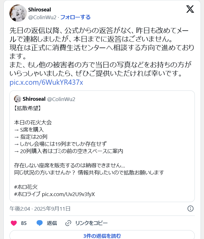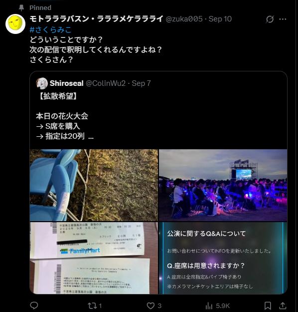 【悲報】ホロライブ花火大会S席チケット座席を用意せず購入者ブチギレこのスレは古いので、もうすぐ消えます。