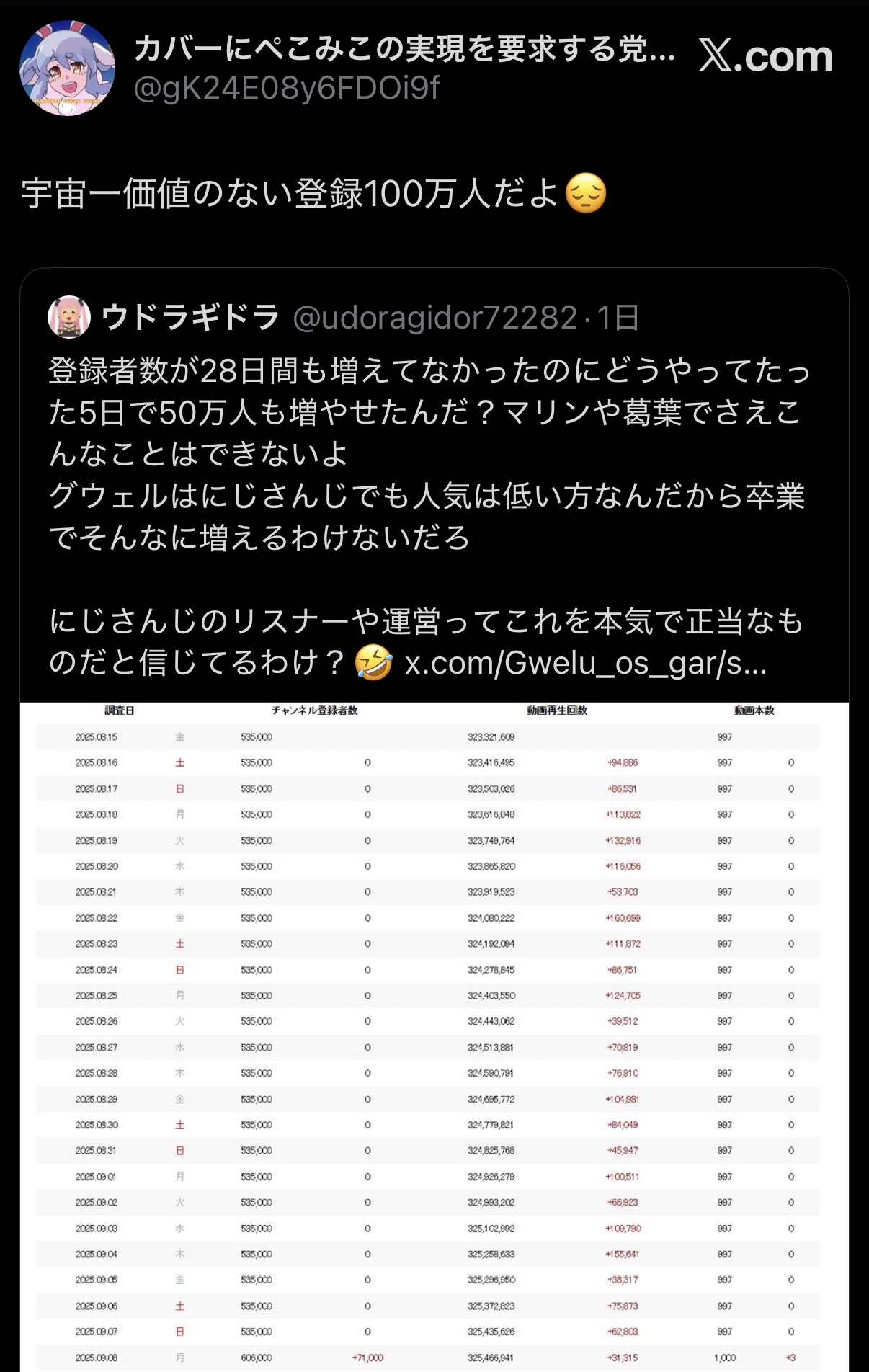 | … | 12125/09/14(日)13:29:12No.1353098816そうだねx3>他所に対してあーあどーすんのでダメコンはかってるけど現実はグウェルのせいでにじさんじライバーの数字は全て信用ないものと証明しただけ |