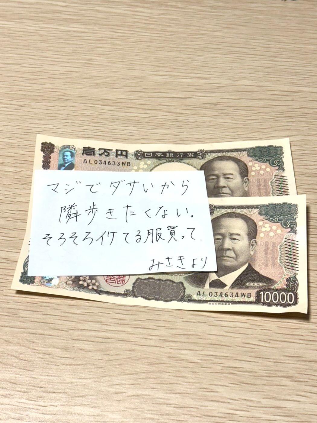 | … | 6425/09/14(日)15:14:24No.1353126221そうだねx1だせえから服買えよって二万くれるの優しすぎる… |