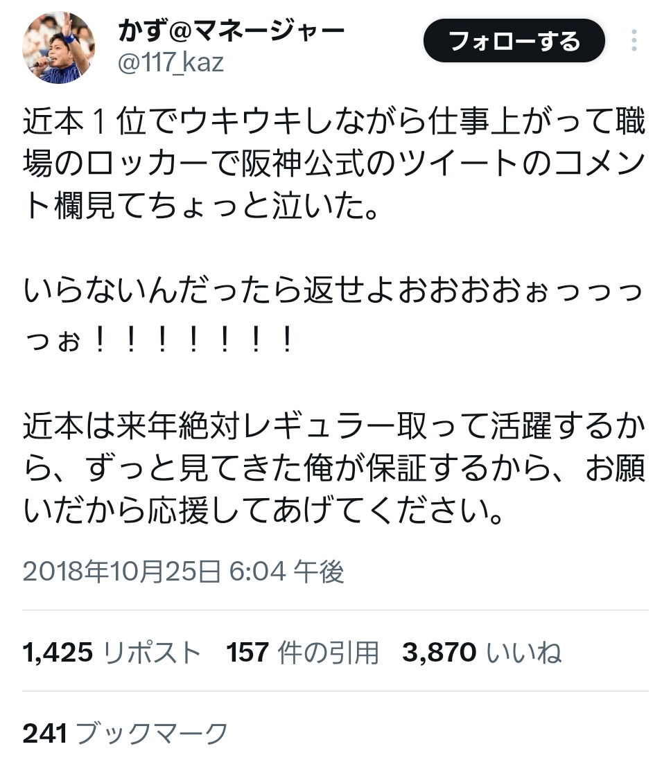 | … | 25325/09/16(火)22:31:04No.1353942581そうだねx1例は色々あるんだけどたぶん12球団合わせても現役選手の中で大勢が一番阪神ファンだと思う |