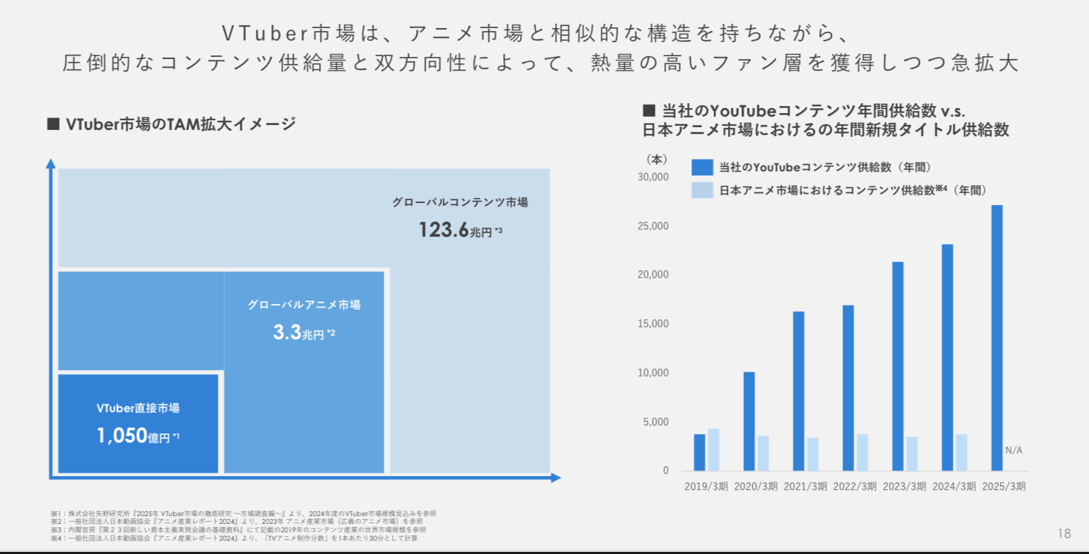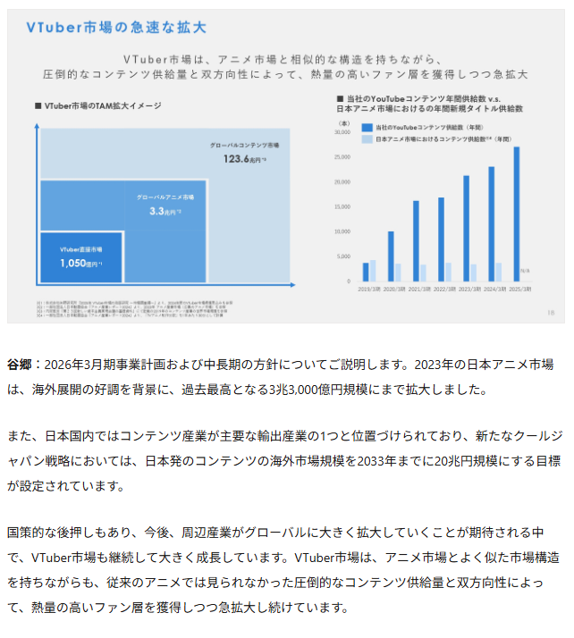 | … | 3225/09/17(水)20:02:37No.1354183872そうだねx1元の資料見れば最近アニメ産業が伸びていてVはアニメ関連産業と近似した市場構造でコンテンツ供給力が比較的に高いからアニメ産業の拡大に合わせて市場の拡大とファン層の拡大に期待できますよってアピールって普通に読み取れるだろ |