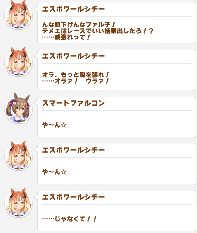 | … | 21225/09/18(木)18:27:11 ID:7d3oy3n.No.1354448583+ファル子さんってあんまり言われませんがマルゼンさん並みに独特な口調してますよね |