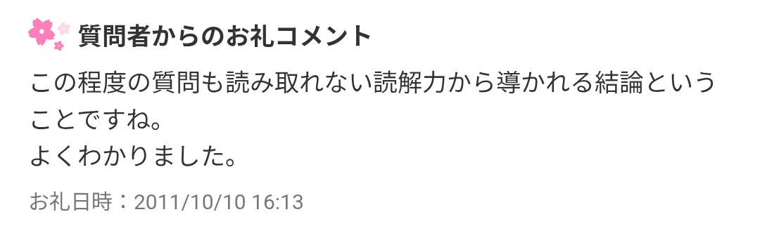 なんとなく知恵袋見てたら怨嗟の塊みたいな御礼コメントが出てて面白かったこのスレは古いので、もうすぐ消えます。