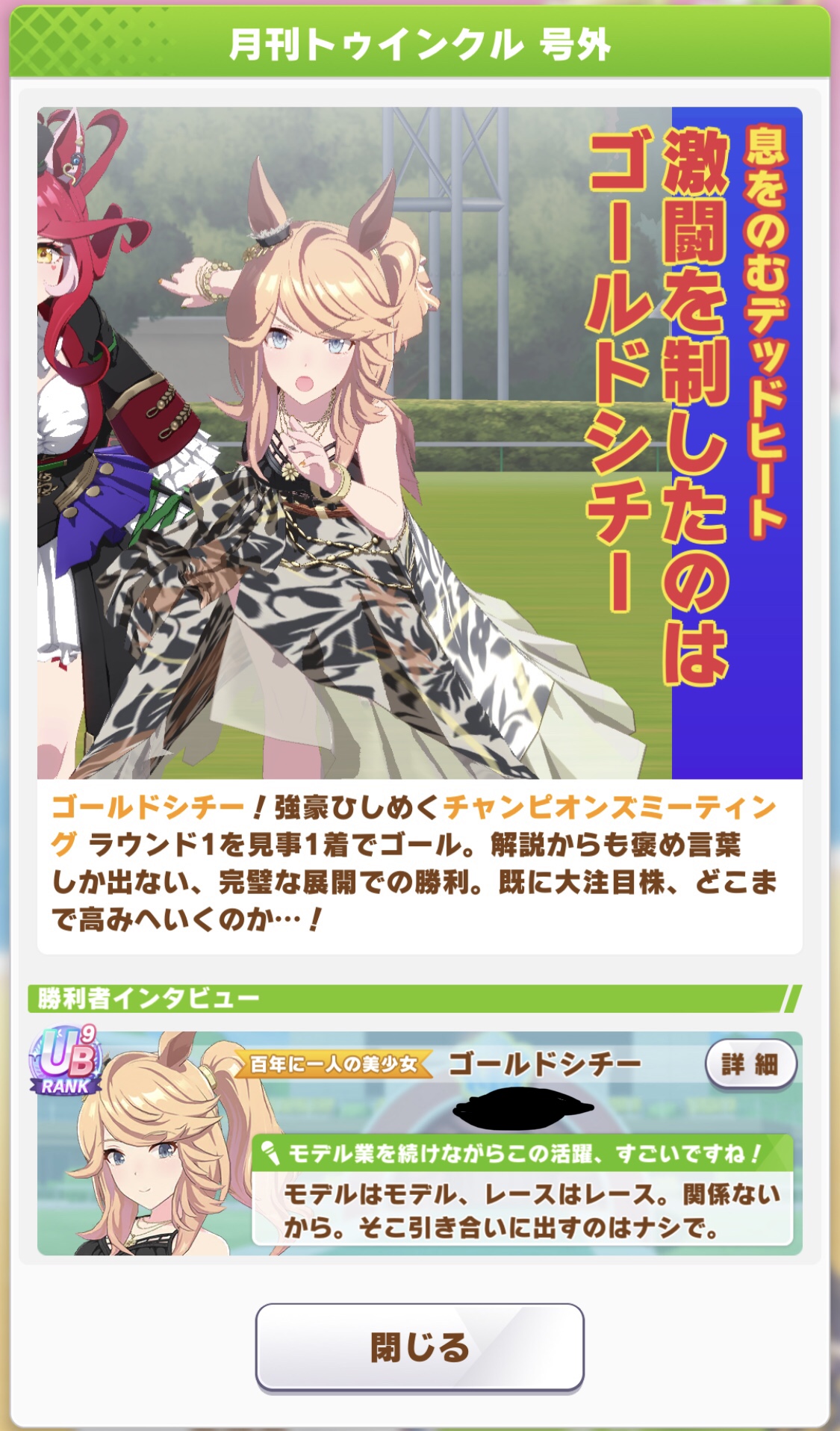 | … | 7525/09/22(月)19:21:08 ID:WG/D74vMNo.1355753883そうだねx1>公式生配信番組「ぱかライブTV Vol.57」の出走者と放送日時が決定しました! ありがとうございます!!! シングレの主題歌発表とか楽しみですね! |