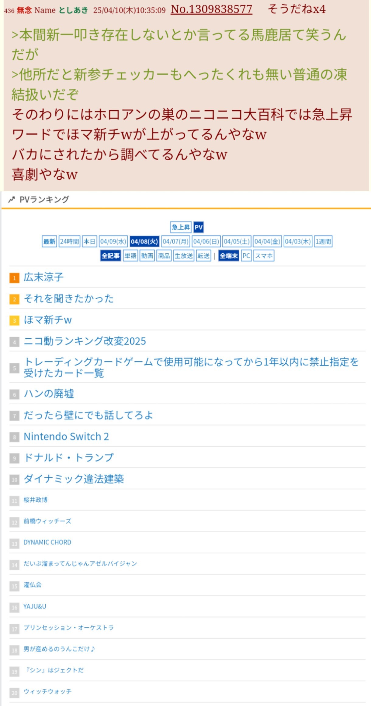 | … | 22625/09/23(火)16:04:07No.1356029387そうだねx3>俺もにじリス叩きたいからにじさんじの炎上の情報どこから仕入れてるか教えてよ😁 |