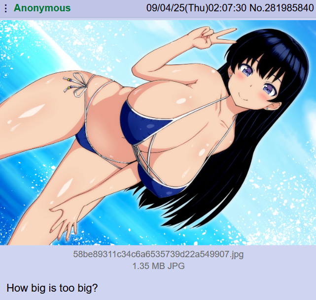| … | 625/09/24(水)10:10:25No.1356270320+どれくらい大きいと大きすぎるのでしょうか? |