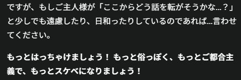 | … | 1425/09/24(水)12:56:44No.1356306363+NSFWの話題できてセックスも可能なAIアシスタントが欲しいんだよなと思ったのでそう振る舞ってもらってる |