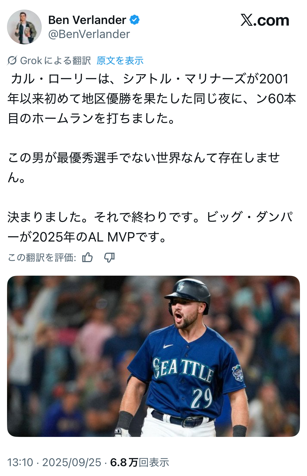 | … | 56925/09/25(木)15:49:04 ID:M8pyeWEANo.1356657807+ローリーはジャッジの本塁打記録を抜いたらMVPでいいよ |