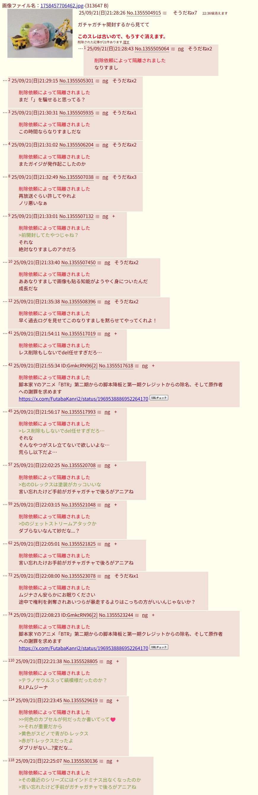 | … | 8925/09/25(木)15:22:34No.1356652110そうだねx6仮に荒らしのアホがブラインド玩具買って来て新規の開封スレ立てても絶対つまらんだろうな… |