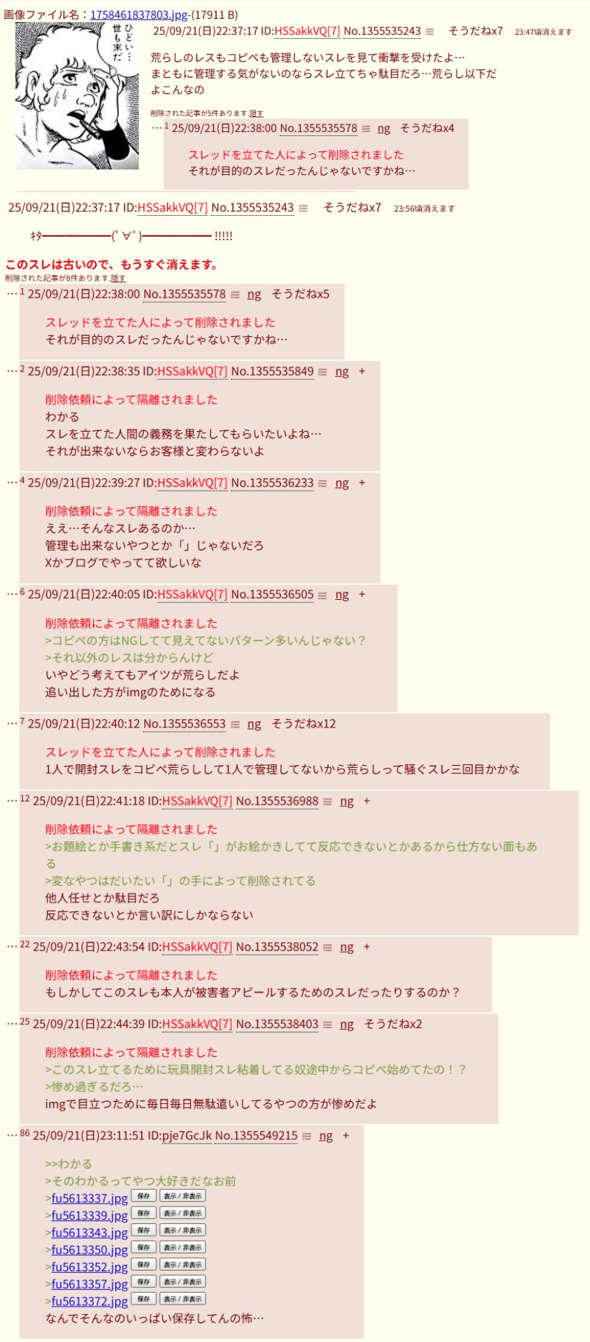 | … | 4025/09/25(木)15:10:12No.1356649382+開封スレの「」が憎くて成りすまして変なこと喚いて開封スレは荒れネタですぞ〜!ってやりたいことだけわかった |