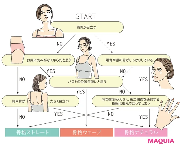 鎖骨や肩甲骨、膝のお皿などの骨が際立った骨組みがしっかりしたボディ。肉感的ではなく、体の厚みには個人差がある。バストや骨盤の位置は高くも低くもなく中間。ゆったりしたリラックス感のある服が似合う。
