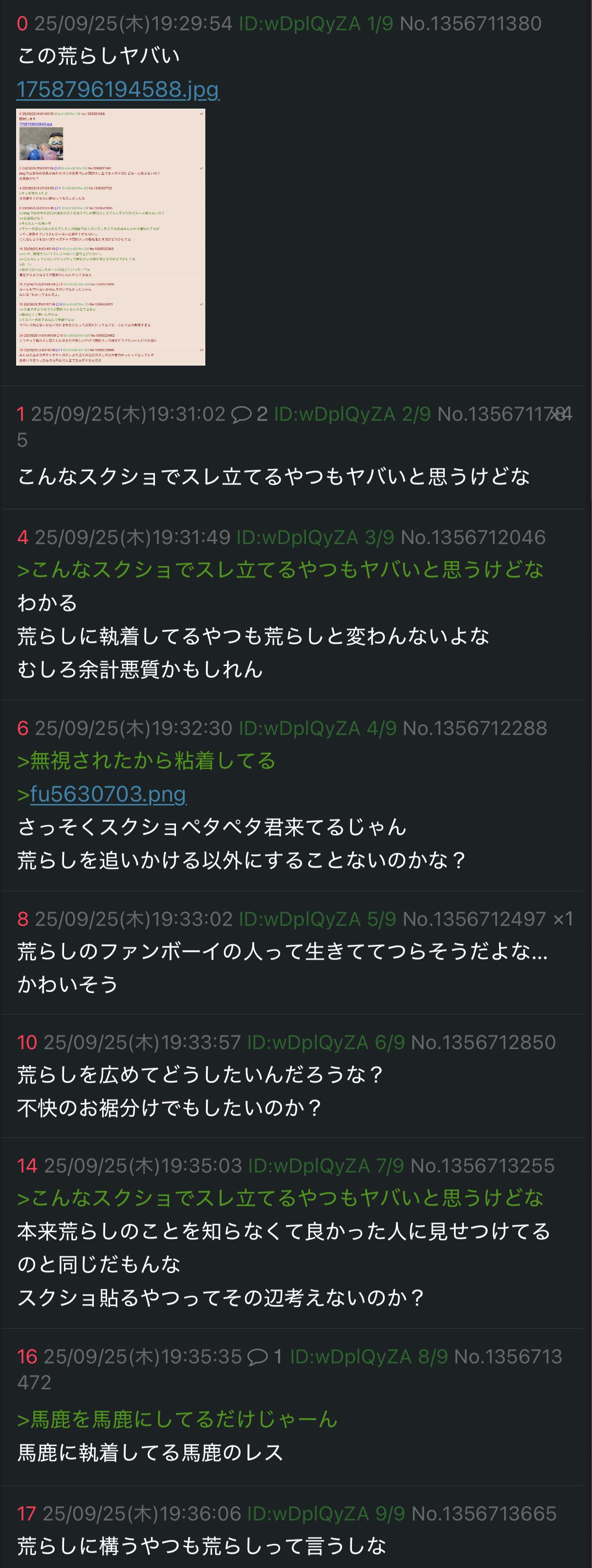 | … | 5425/09/26(金)20:05:38No.1357037846+コピペ荒らし湧いても管理しないのは荒らしなんだっけ粘着の理屈じゃ |