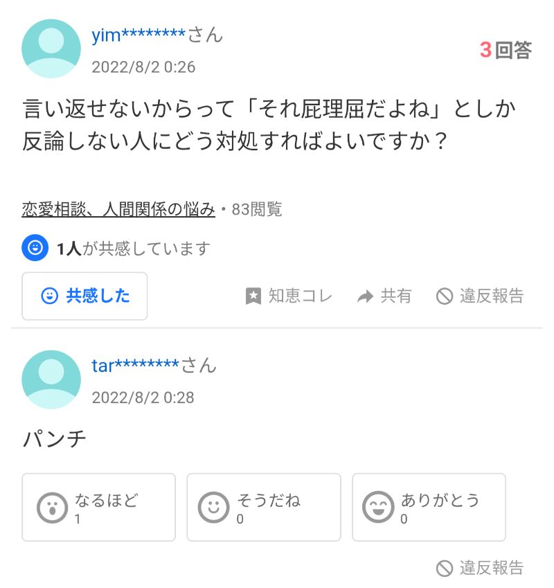 | … | 1925/09/28(日)11:27:49No.1357588212+でも相手の方が先にパンチしてきたら? |