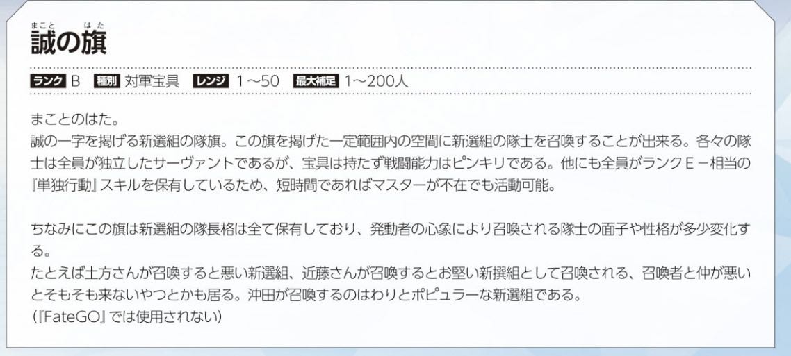 | … | 7625/09/29(月)23:42:08No.1358204727そうだねx3>初期設定だと隊長格が全員同じ宝具持ってて誰が出てくるのかは使う奴によって違うっていう代物だったけど |