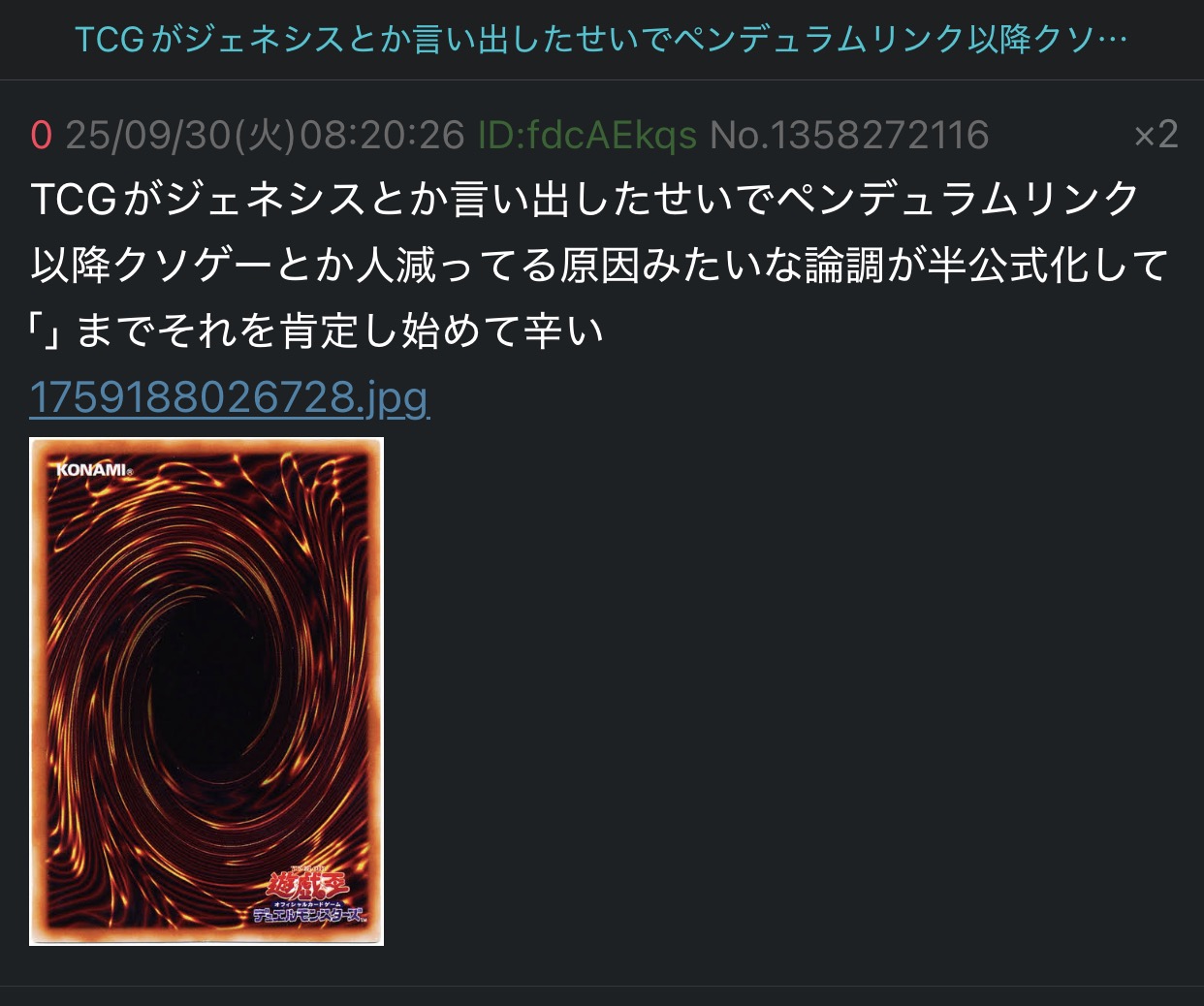 | … | 2025/09/30(火)12:10:44No.1358314114そうだねx7>遊戯王はもう誰も求めてないからな |