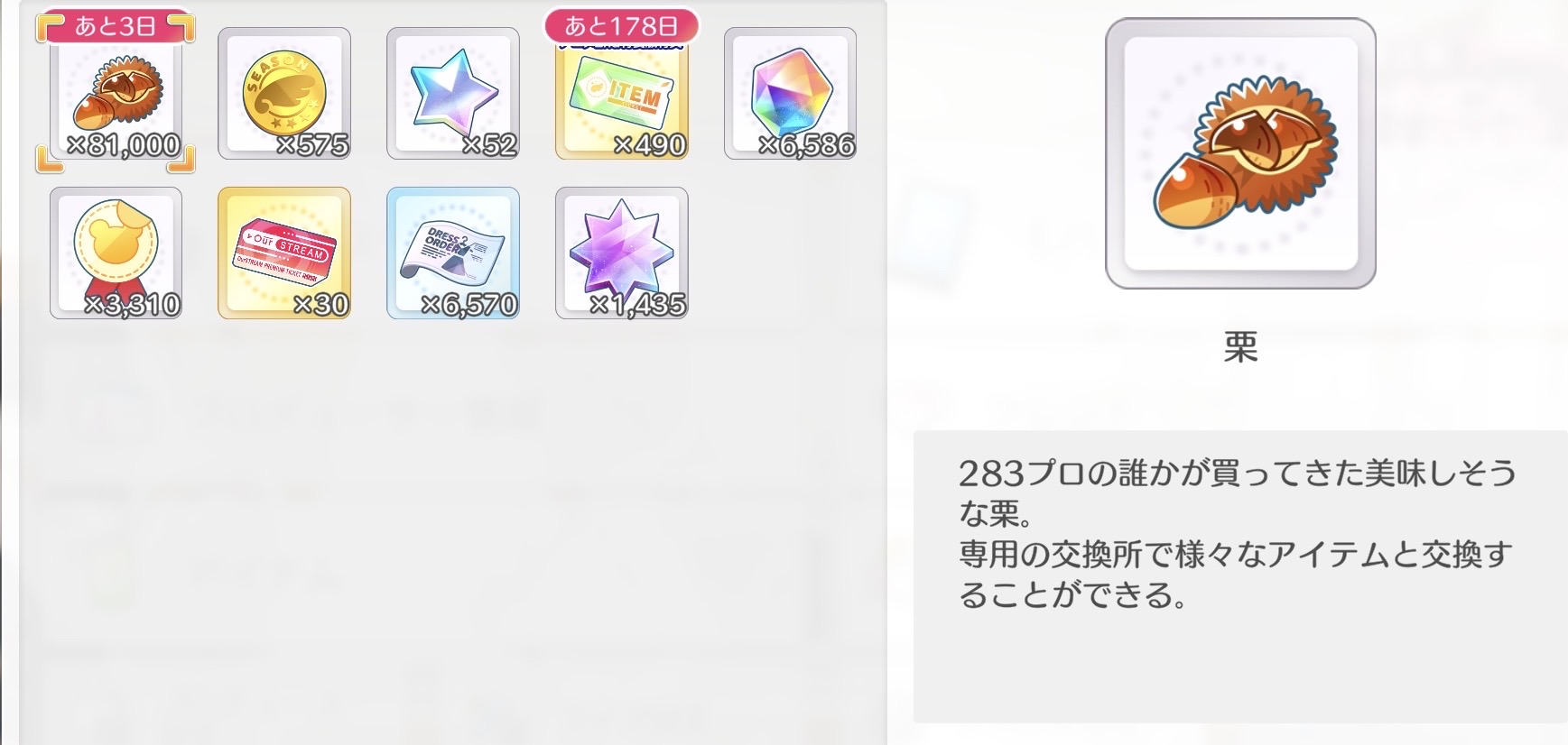 | … | 5725/09/30(火)21:32:14No.1358474166+>シャニパの栗使わずに限界まで貯めたら8万個超買ってこられてしまった |