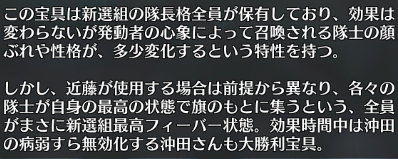 | … | 9625/10/02(木)00:30:08No.1358822052+>ぐだを使えば無限に新撰組を召喚できるようになったのではないだろうか |